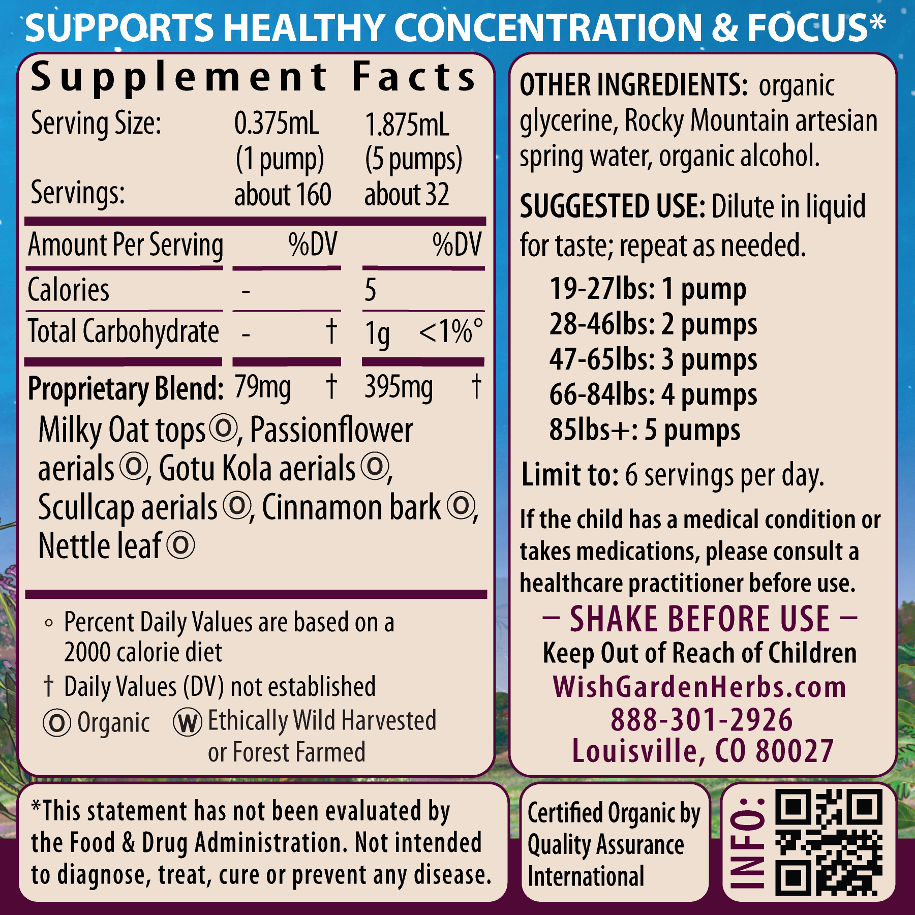 Organic Milky Oat tops (Avena sativa), organic Passionflower aerials (Passiflora incarnata), Gotu Kola aerials (Centella asiatica), organic Scullcap aerials (Scutellaria lateriflora), Cinnamon bark (Cinnamomum bumanii, C. cassia), organic Nettle leaf (Urtica dioica), vegetable glycerine, Rocky Mountain artesian spring water & organic gluten-free alcohol.