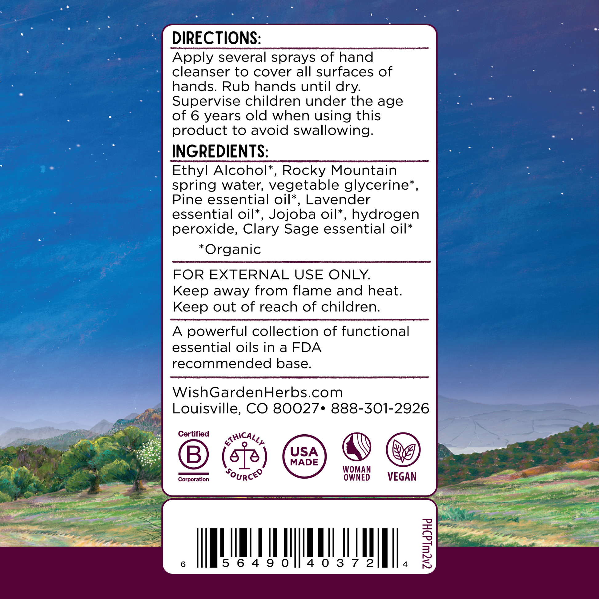 Organic Ethyl Alcohol, Rocky Mountain spring water, vegetable glycerine, organic Pine essential oil, organic Lavender essential oil, organic Jojoba oil, hydrogen peroxide, organic Clary Sage essential oil